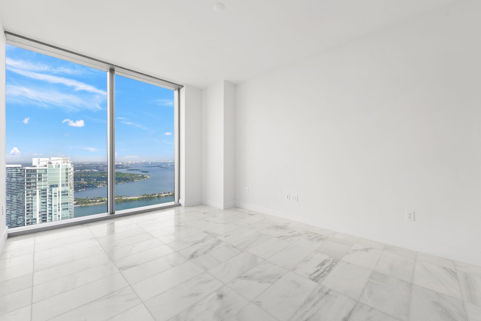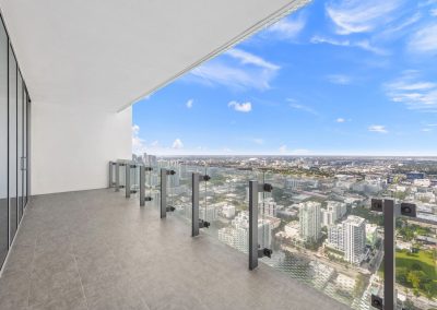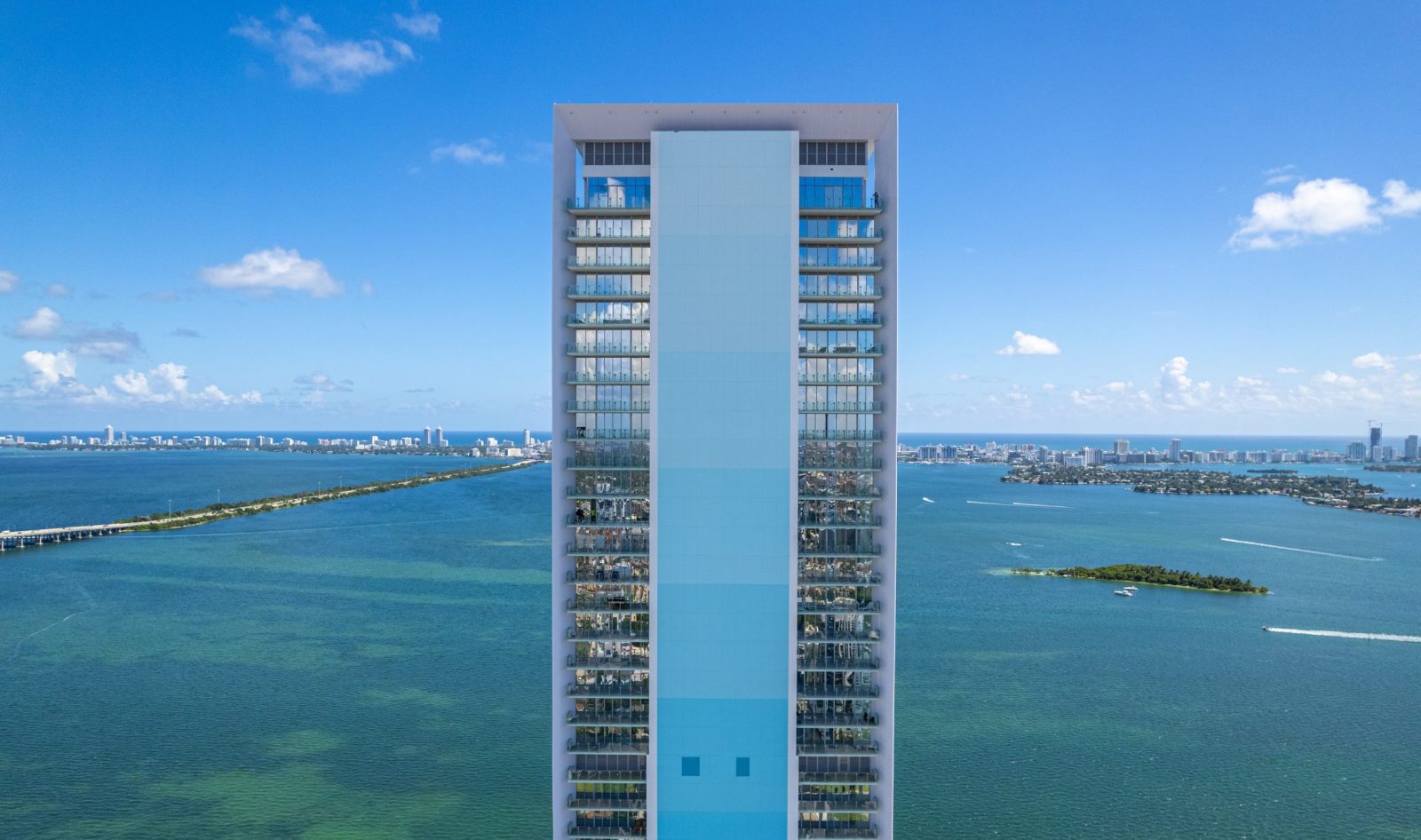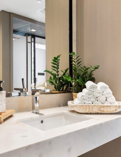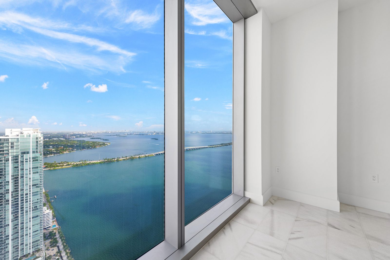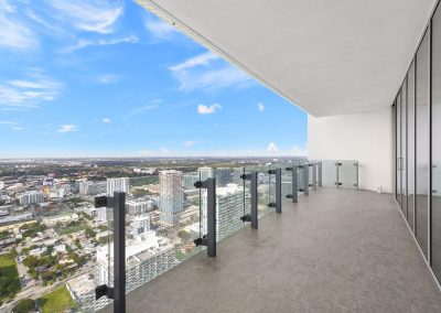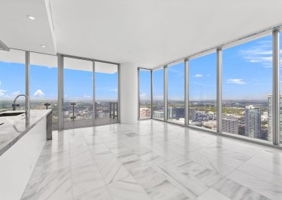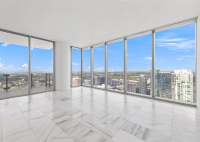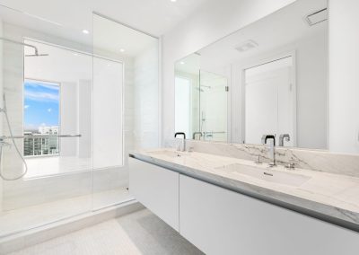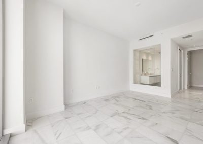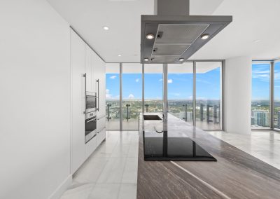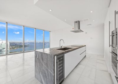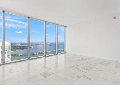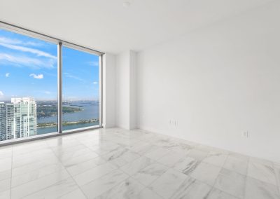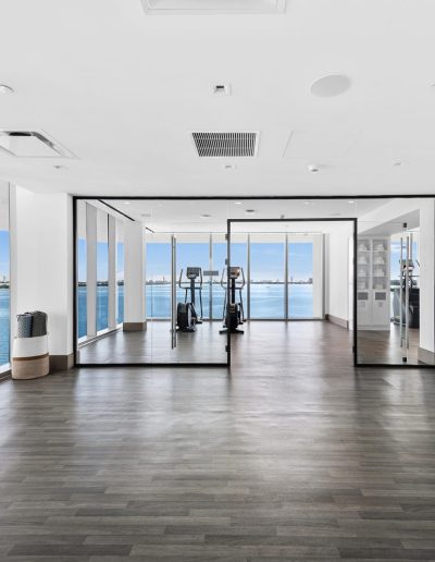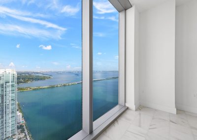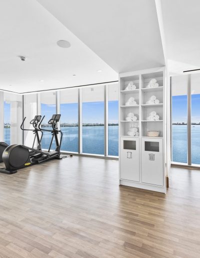 On floors 5 though 7, amenities include a bayfront lounge with a pool overlooking the water; a media room; a beauty salon; a children’s playroom; a pet spa; an expansive gym overlooking the bay; and one of Miami’s largest, resident-only spas. An outdoor bridge connects the sixth floor’s indoor amenities suite to the flow-through pool deck, which includes cabanas, an Olympic-sized lap pool, plunge pools, children’s water features, and an elevated tennis court.