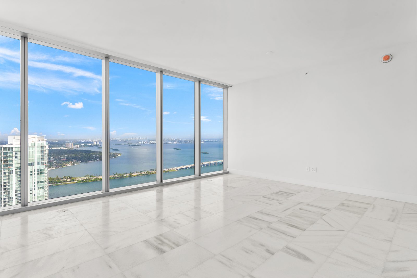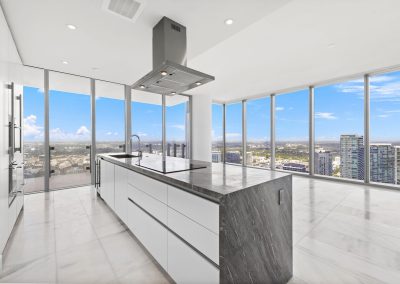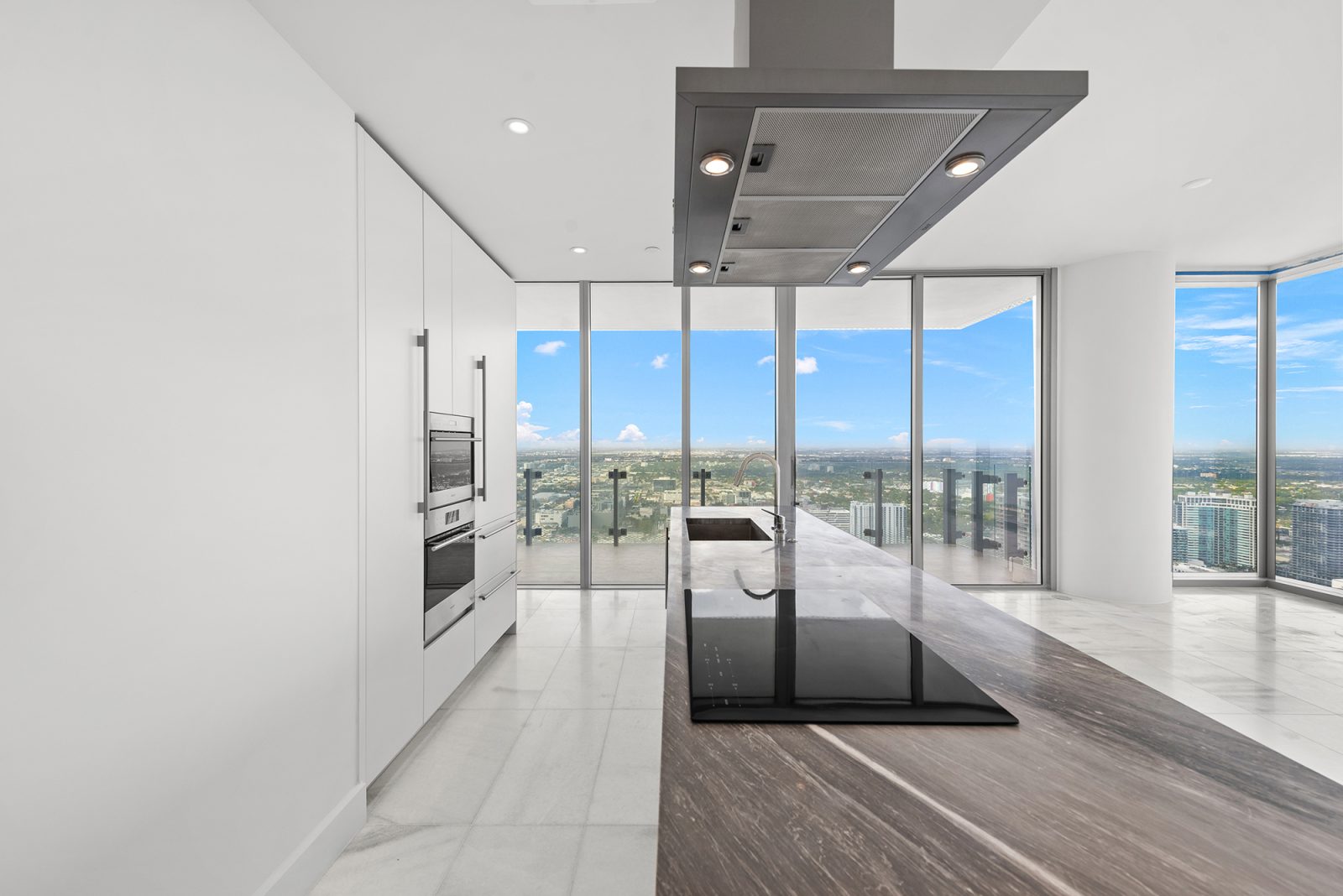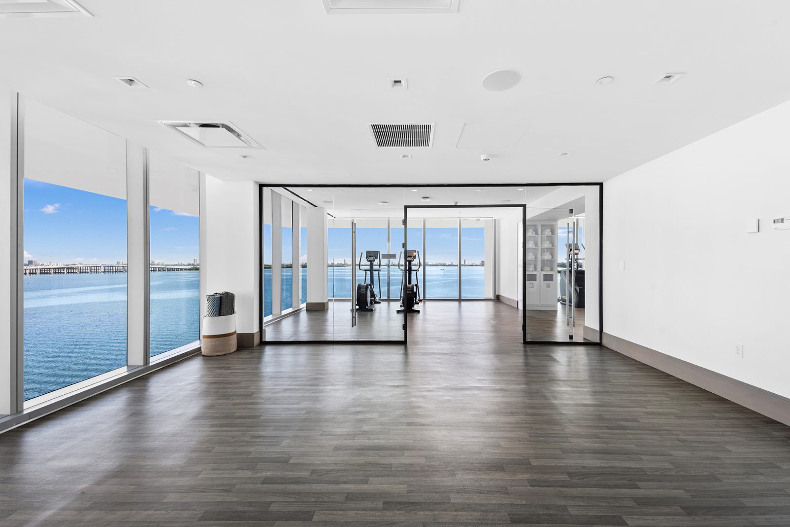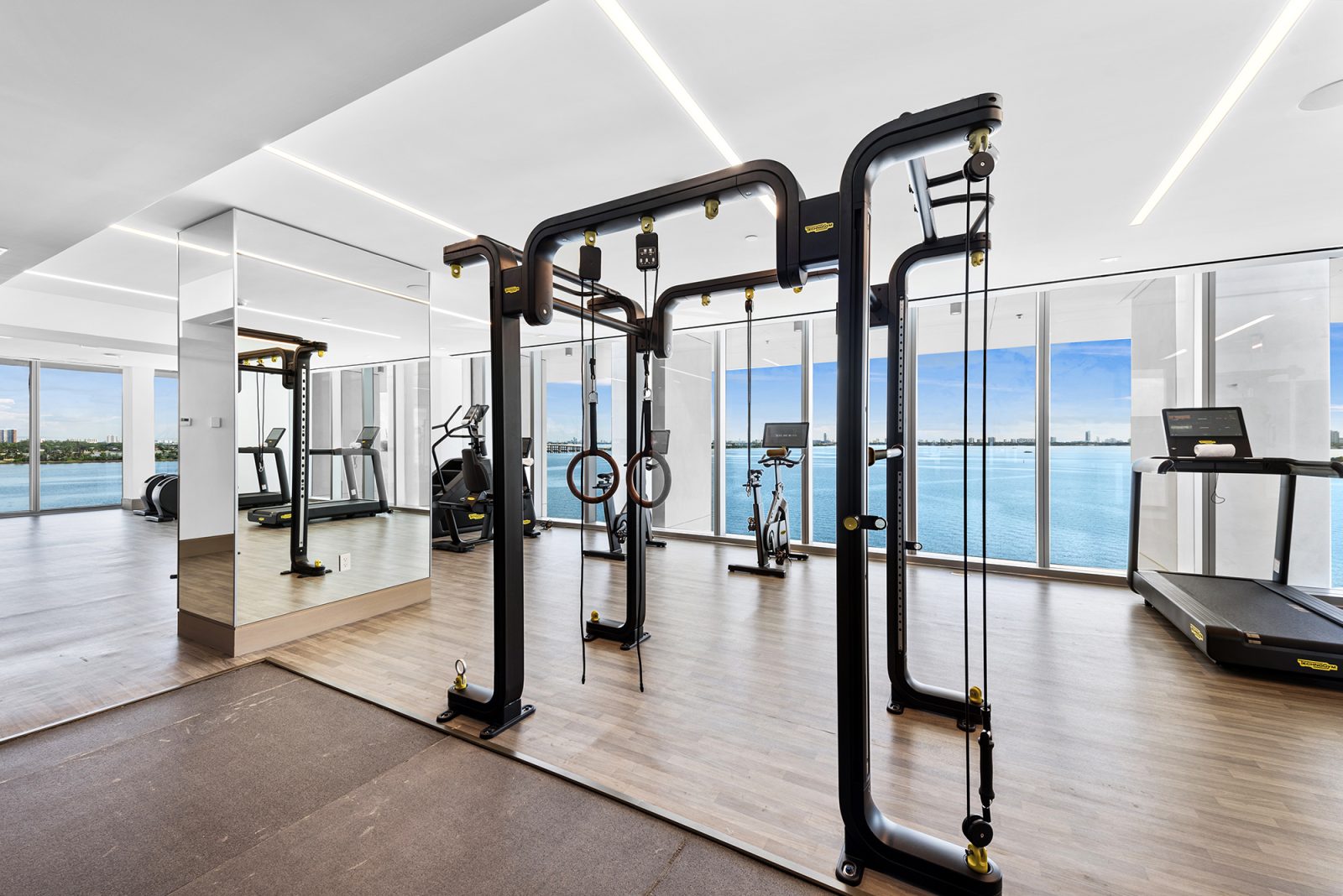 On floors 5 though 7, amenities include a bayfront lounge with a pool overlooking the water; a media room; a beauty salon; a children’s playroom; a pet spa; an expansive gym overlooking the bay; and one of Miami’s largest, resident-only spas. An outdoor bridge connects the sixth floor’s indoor amenities suite to the flow-through pool deck, which includes cabanas, an Olympic-sized lap pool, plunge pools, children’s water features, and an elevated tennis court.